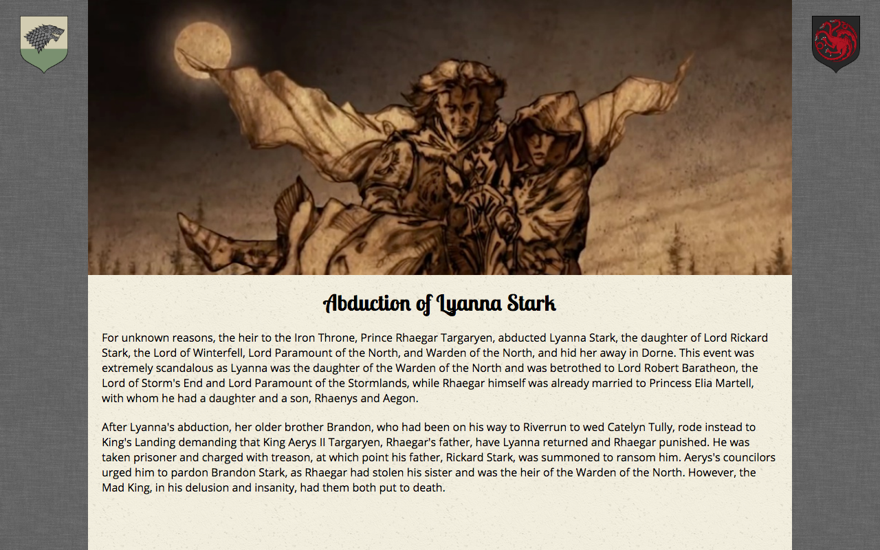 WesterBros is a Game of Thrones inspired app. It is an app that allows users to view all the major engagements of Roberts Rebellion. It shows the Houses on each side, as well as a description of the battle.